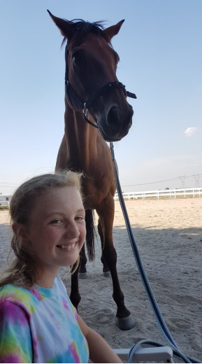 我在家接受教育并且每周有三天我会在当地的熟食店帮忙。我家30亩的农场上养着三匹马:两匹纯种阿拉伯马(那姆和诺拉)还有一匹叫吉米的阿拉伯骑乘矮马。